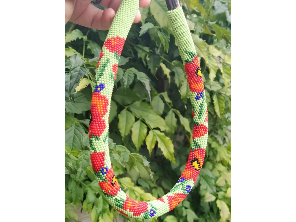 Náhrdelník vyrobený technikou háčkování s korálky.
