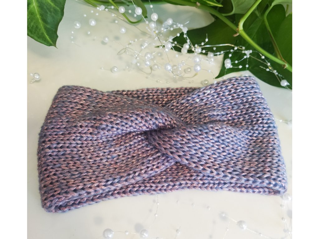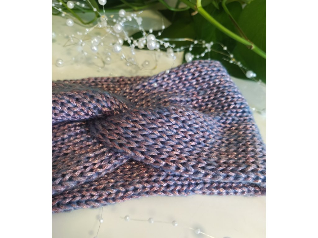 Dámská čelenka s uzlem, pletená ze zajímavé příze s kovovým odleskem. Hřejivá, lehká, jemná a pružná.