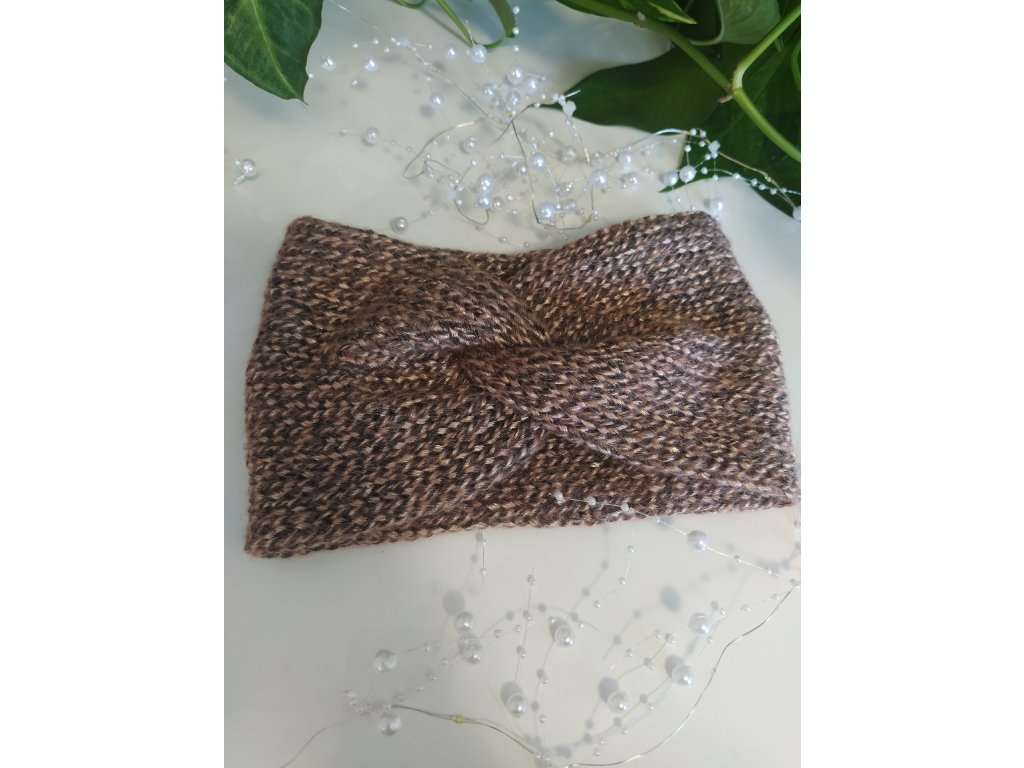 Dámská čelenka s uzlem, pletená ze zajímavé příze s kovovým odleskem. Hřejivá, lehká, jemná a pružná.